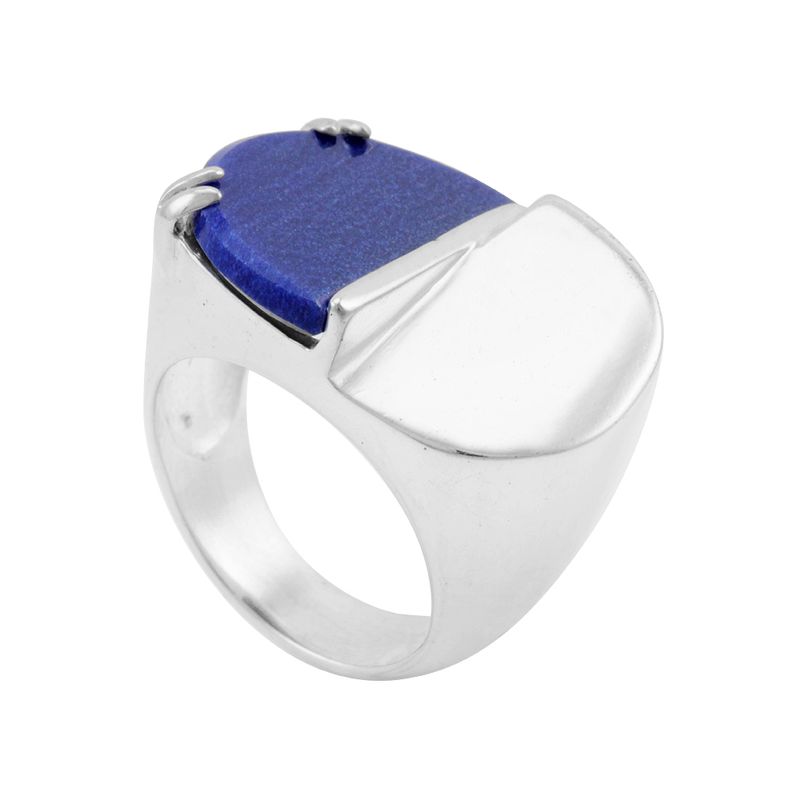 Anel em Prata 925 no formato oval com a metade polida e a outra metade com Soldalita. Possui acabamento polido.