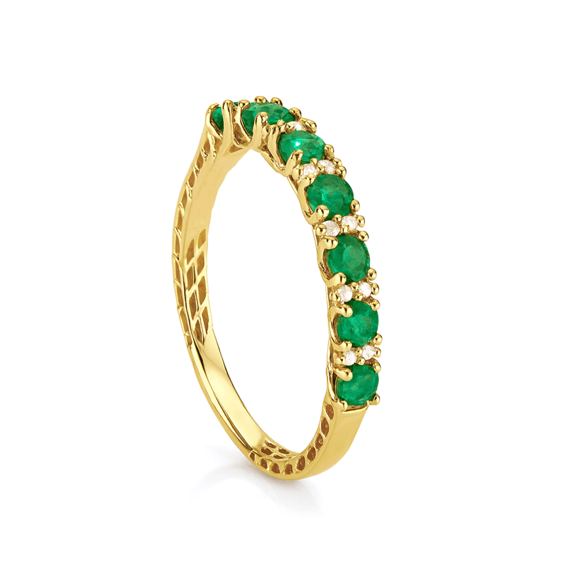 Anel meia aliança em Ouro 18K com esmeraldas redondas. Possui 12 diamantes de 0,5 pts.