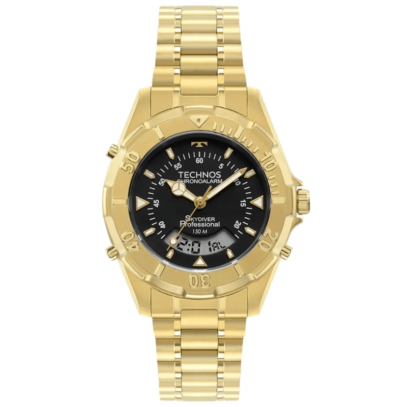 Relógio Masculino Technos Skydiver - WT2050AFN/1P. É um relógio com 40mm de largura. Possui resistência à água de 15atm. Com essa classificação o relógio é resistente às ocasiões mais comuns como chuva lavar as mãos e tomar banho de chuveiro por exemplo. Sua caixa e pulseira em aço, seu vidro é de cristal mineral e possui mostrador preto. Seu funcionamento é AnaDig.