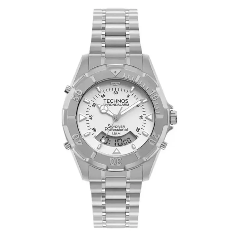 Relógio Technos Masculino Skydiver - WT2050AEN/1B. É um relógio com 40mm de largura. Possui resistência à água de 15atm. Com essa classificação o relógio é resistente às ocasiões mais comuns como chuva lavar as mãos e tomar banho de chuveiro por exemplo. Sua caixa e pulseira em aço, seu vidro é de cristal mineral e possui mostrador branco. Seu funcionamento é AnaDig.